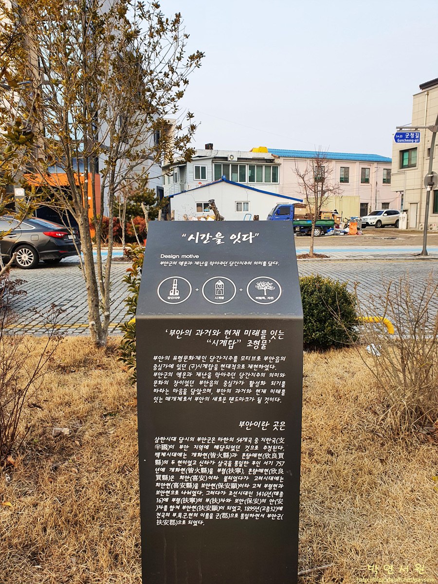시계탑은 부안의 액운과 재난을 막아주는 전북도 무형문화재 제59호인 서외리 당간을 모티브로 부안의 과거와 현재, 미래를 잇는 매개체이자 광장내 다른 작품들과 조화를 유도하는 상징물로 조성돼 부안의 새로운 랜드마크로 우뚝 섰다.