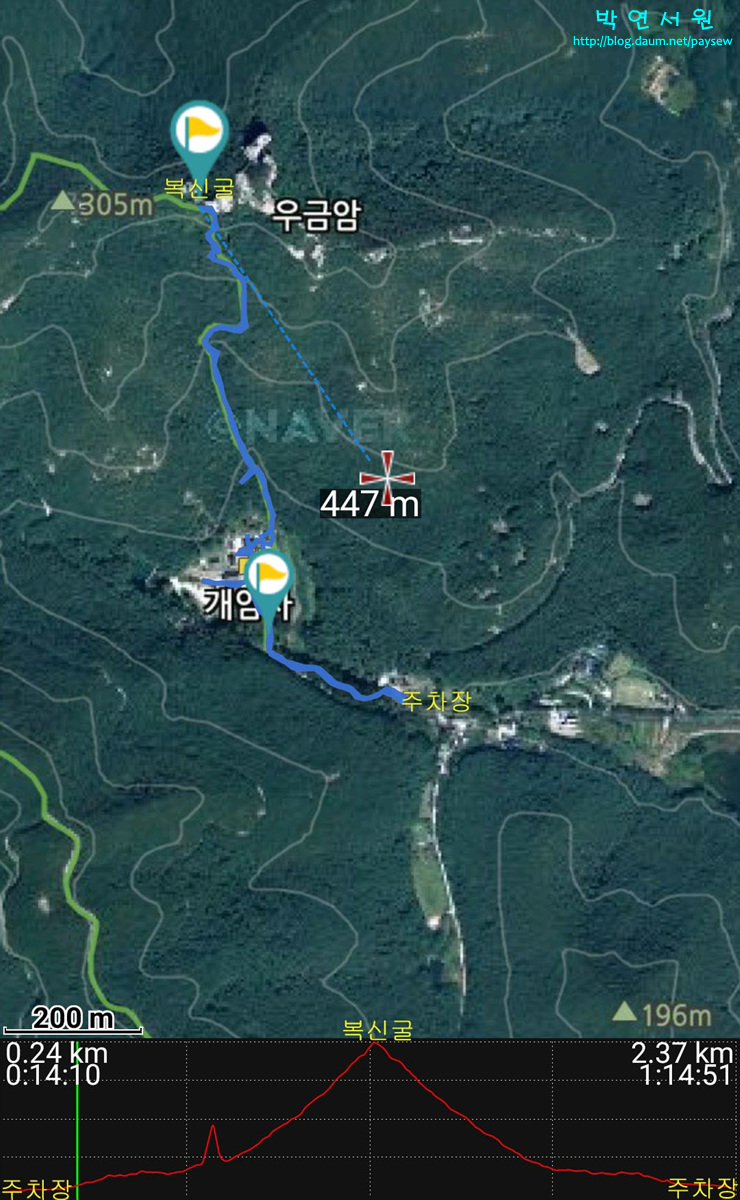 (개암사/우금산 운동거리 2.5/2.37/3.1km, 운동시간 총1시간51분, 순1시간24분/14분/18분,
