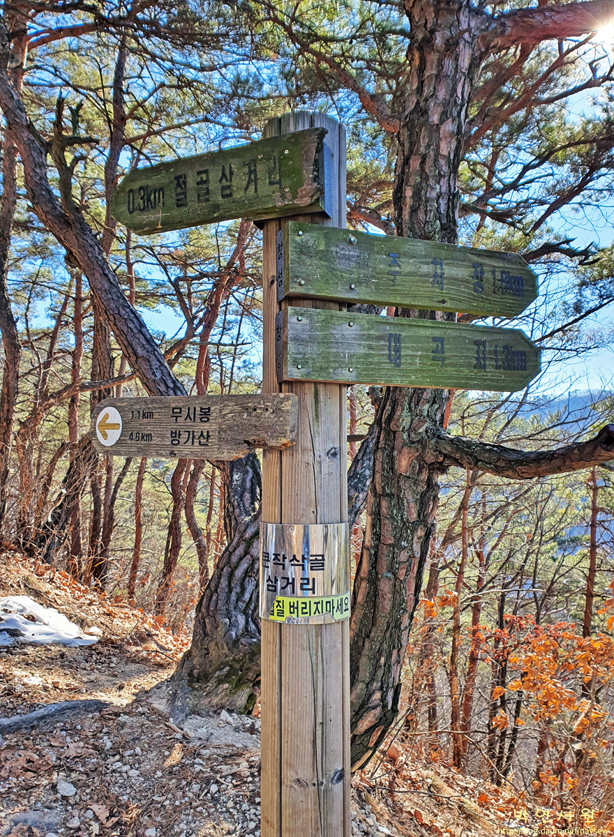 비탈을 5분쯤 오른 뒤 이장된 묘터에 이르면 길은 한결 수월해진다. 20분 뒤 큰작사골삼거리다. 암릉 구간만 임팩트 있게 맛보고 싶다면 여기서 오른편 계곡을 따라 내려가면 대곡지를 지나 주차장으로 곧바로 가는 4㎞의 짧은 코스가 완성된다.