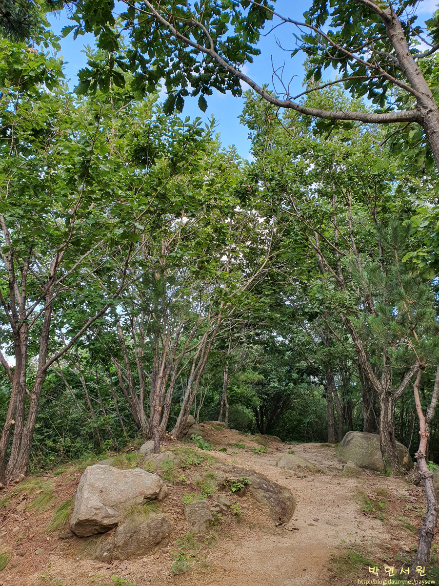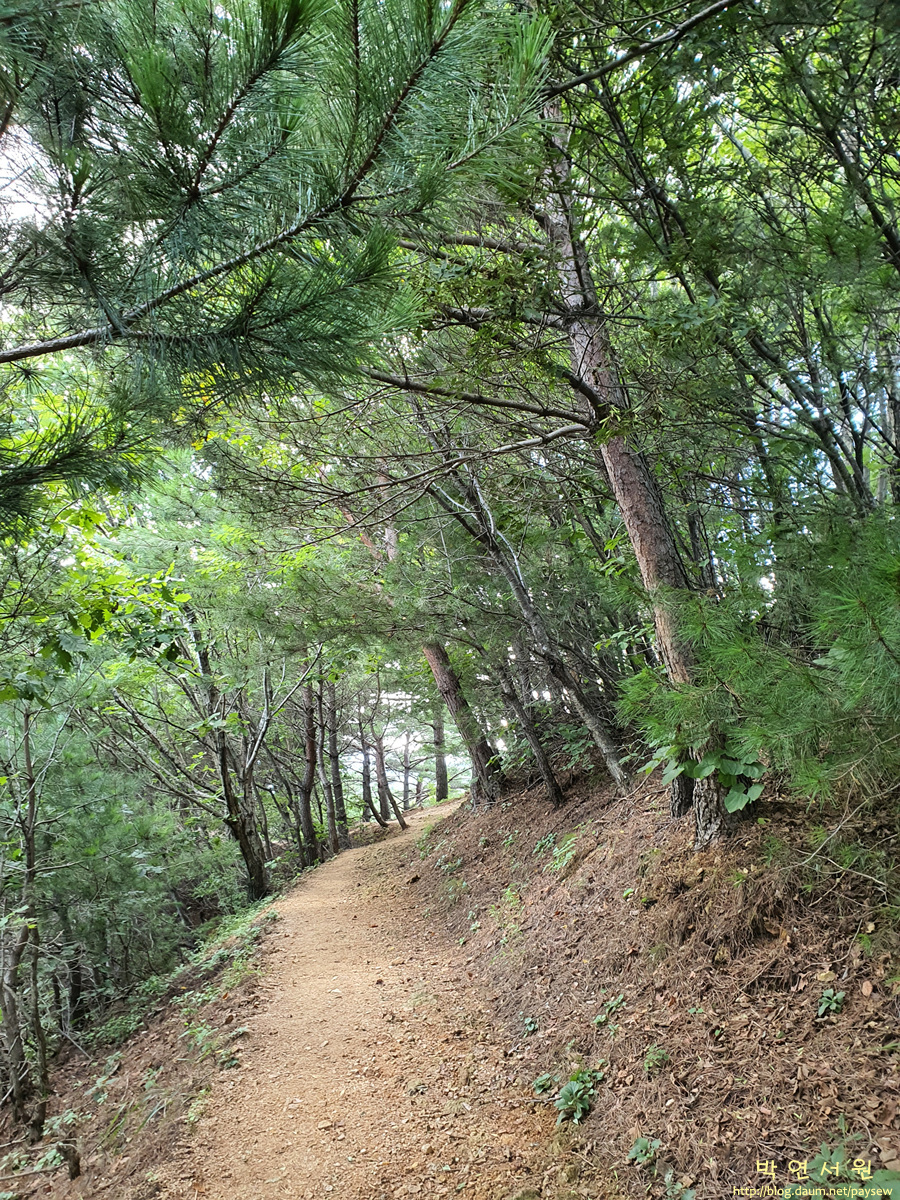 정상 바로 아래에서 날머리인 북삼초교까지는 임도로도 이어져 있는데 거리는 약 6km이다.