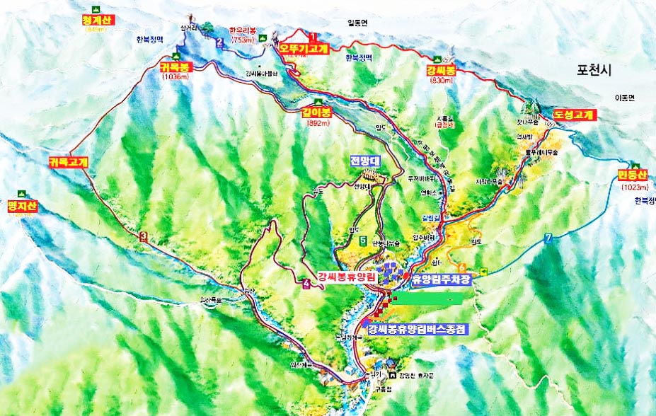 경기도 포천시와 가평군의 경계를 이루는 강씨봉은 옛날 이 곳에 강씨가 모여 살았다 하여 붙여진 이름이라 한다. 강씨봉에서 동남쪽으로 뻗어 내리는 능선 길에 강씨봉고개가 있으며, 고갯마루에서 동쪽 아래에 강씨봉 마을터가 남아있다.