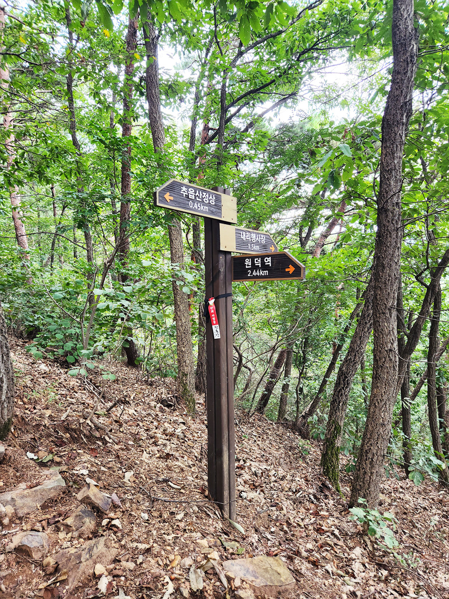 동암역07:53-(직행)-용산역08:30/08:46-원덕역10:16/10:27-등산안내도,두레마을입구(↑추읍산정상1.45,↓원덕역1.44)10:48-급경사시작10:52-(1코스)-공터10:59/11:01-휴식11:35/11:45-벤치쉼터(전망대, →삼림욕장0.2,원덕역5.2)11:47/11:58-갈림길3거리(↑추읍산정상0.8,←약수터1.4,↓원덕역2.24)11:59-갈림길(↖추읍산정상0.45,↗내리행사장1.5,↓원덕역2.44)12:09-능선3거리[≒640, →추읍산정상0.17,←용문(중성)등산로입구2.43,↓내리등산로입구(원덕역)1.97]12:20/12:23-(우)-H장(≒655),추읍산정상(583,≒660)12:26/13:27(중식)-갈림길3거리(←주읍리등산로입구2.2,↑내리등산로입구1.35,↓추읍산정상0.15)13:31-(좌)-갈림길4거리[↑능골(섬실)1.65,→주읍리입구1.0,←추읍산정상0.75,↓추읍산정상0.63]13:47/13:48-(직진, 6코스)-희망볼랫길(원덕역11.0)14:13-등산안내도(≒280, 화전리, →쉼터0.32)14:16-(우)-등골송어횟집(T031-774-5347)14:17-등골횟집3거리(≒235)14:26/14:34-(좌)-대성산 성화사14:38-칠읍산쉼터14:41/14:49-삼성1리(섬실)버스정류장(≒215, ↑용문,↓화전2리)14:55-(우)-쉼터15:09/15:40-섬실(석실)고개4거리,용문등산로(≒305, ↑흑천,←꼬부랑산0.75,→약수터0.67,↓등골)15:47/15:48-흑천(신내천)징검다리(↓원덕역15.1)16:03/16:06-다문8리(두집담)표지석16:16-용문역16:22/16:30-큰사랑순대16:31/17:50(석식)-용문역17:56/18:24-회기역19:35/21:49(노래방)-동암역23:05