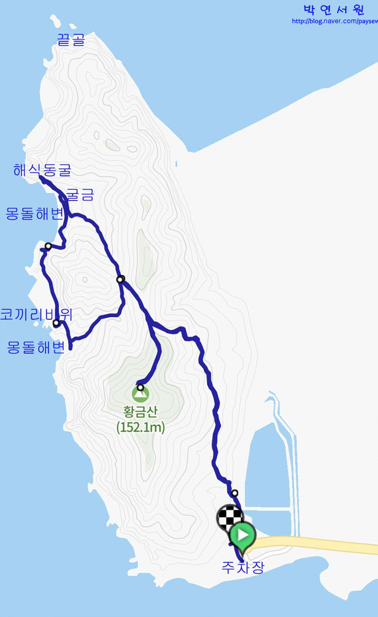 코스 : 주차장-황금산-코끼리바위-굴금-해식동굴-주차장