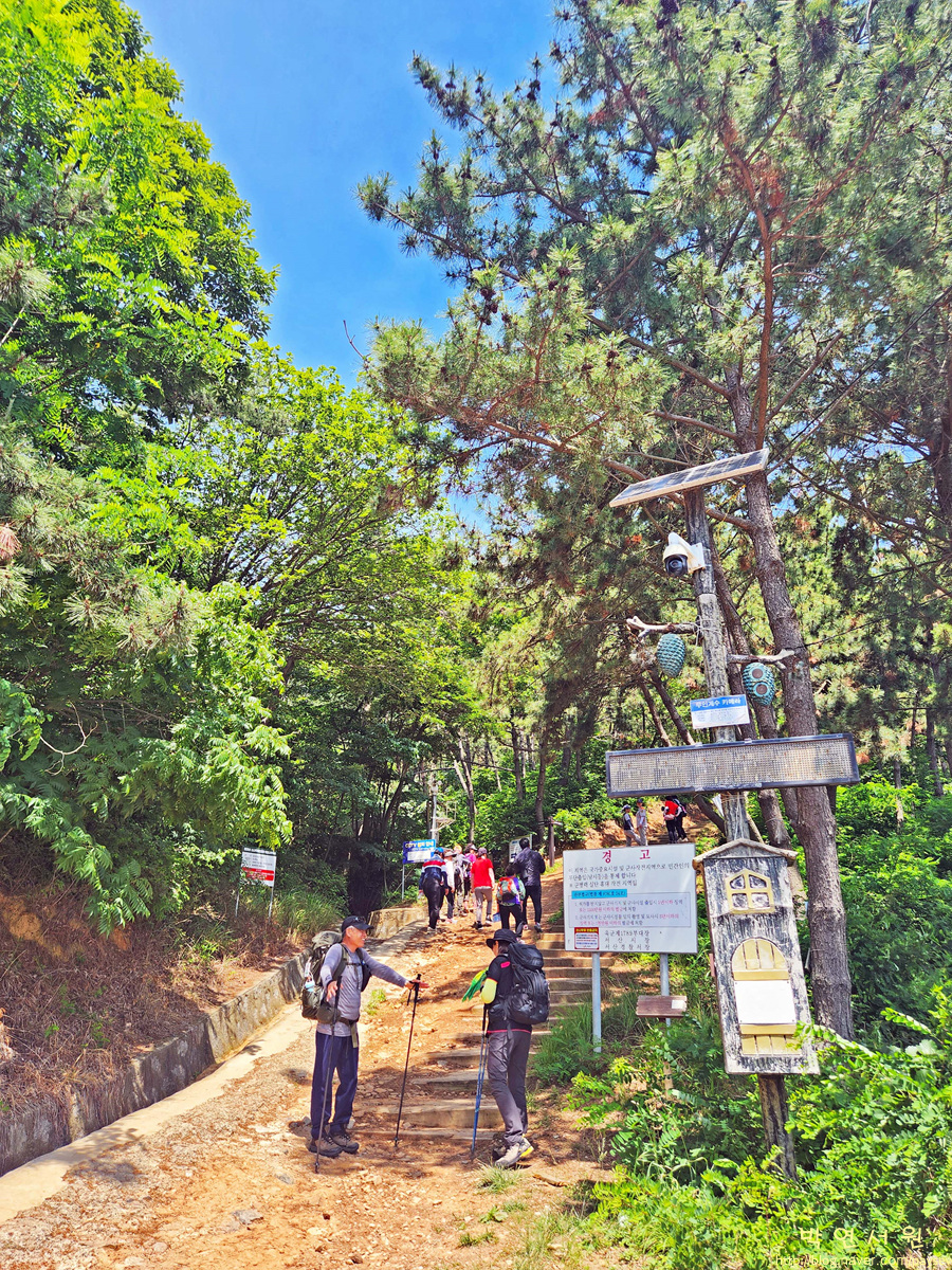 주차장을 들머리로 삼아 잘 정비된 나무계단을 오른다. 곧바로 좌측으로 뚫린 숲길은 정상으로 향하는 지름길이다. 정상까지는 고작해야 20분 거리. 하지만 경사가 가파르기에 만만하게 볼 게 아니다. 소나무가 주종을 이루는 숲은 초겨울에 들어선 이즈음에도 산색이 푸르다.