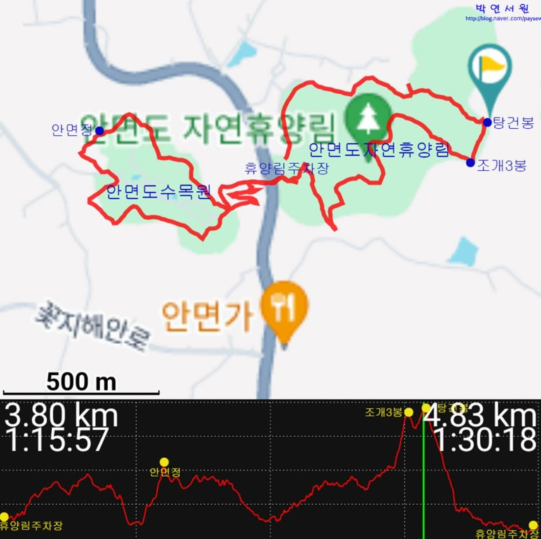 (안면도수목원+자연휴양림 보행거리 4.84k/4.83/4.8m, 보행시간 총1시간39분, 순1시간36분/30분/37분,