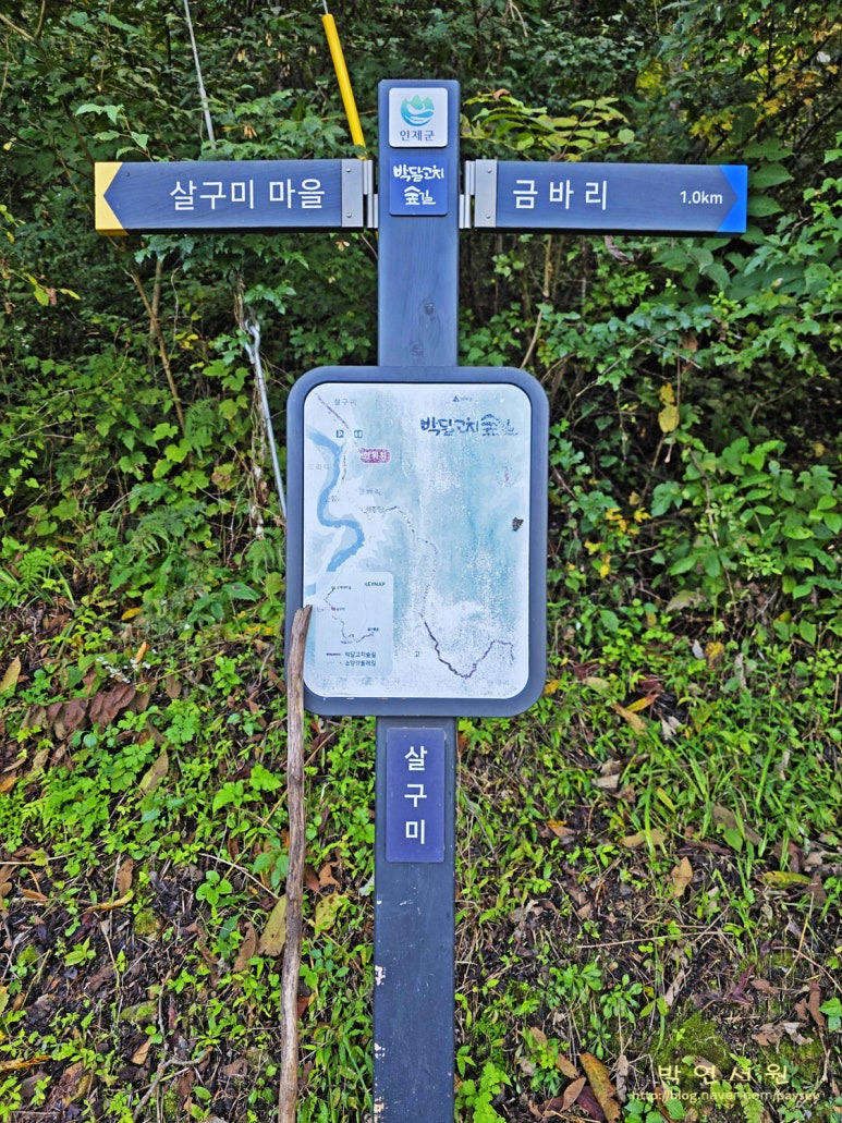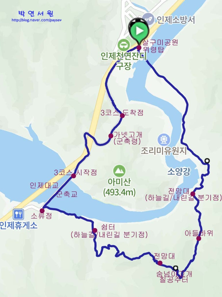 ㅇ1코스 : 자유 수호희생자위령탑 주차장(강원 인제군 인제읍 남북리 435-11)-살구미마을-춘향골-전망대-소류정-군축교-3코스 입구-병풍폭포-위령탑 주차장(강원 인제군 인제읍 남북리 435-11) (12km/4시간)