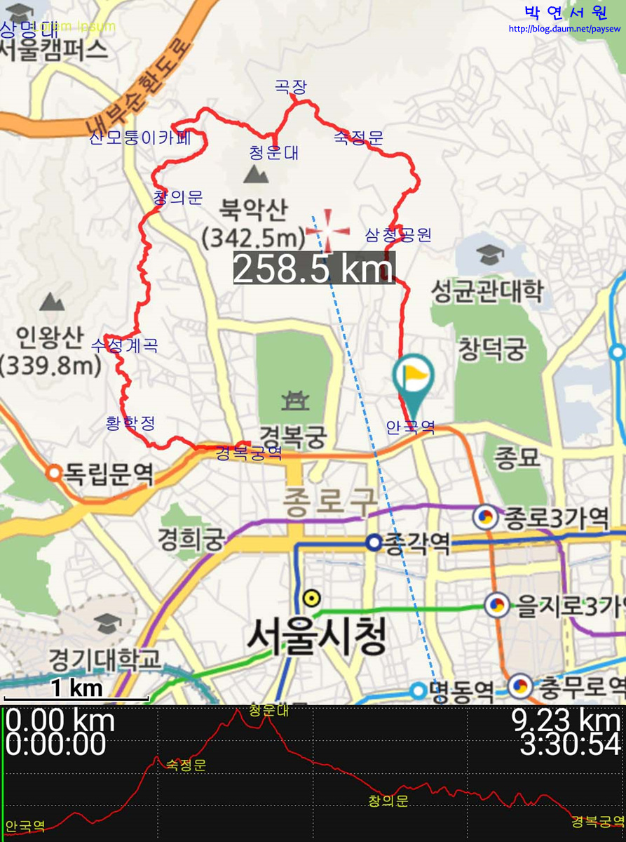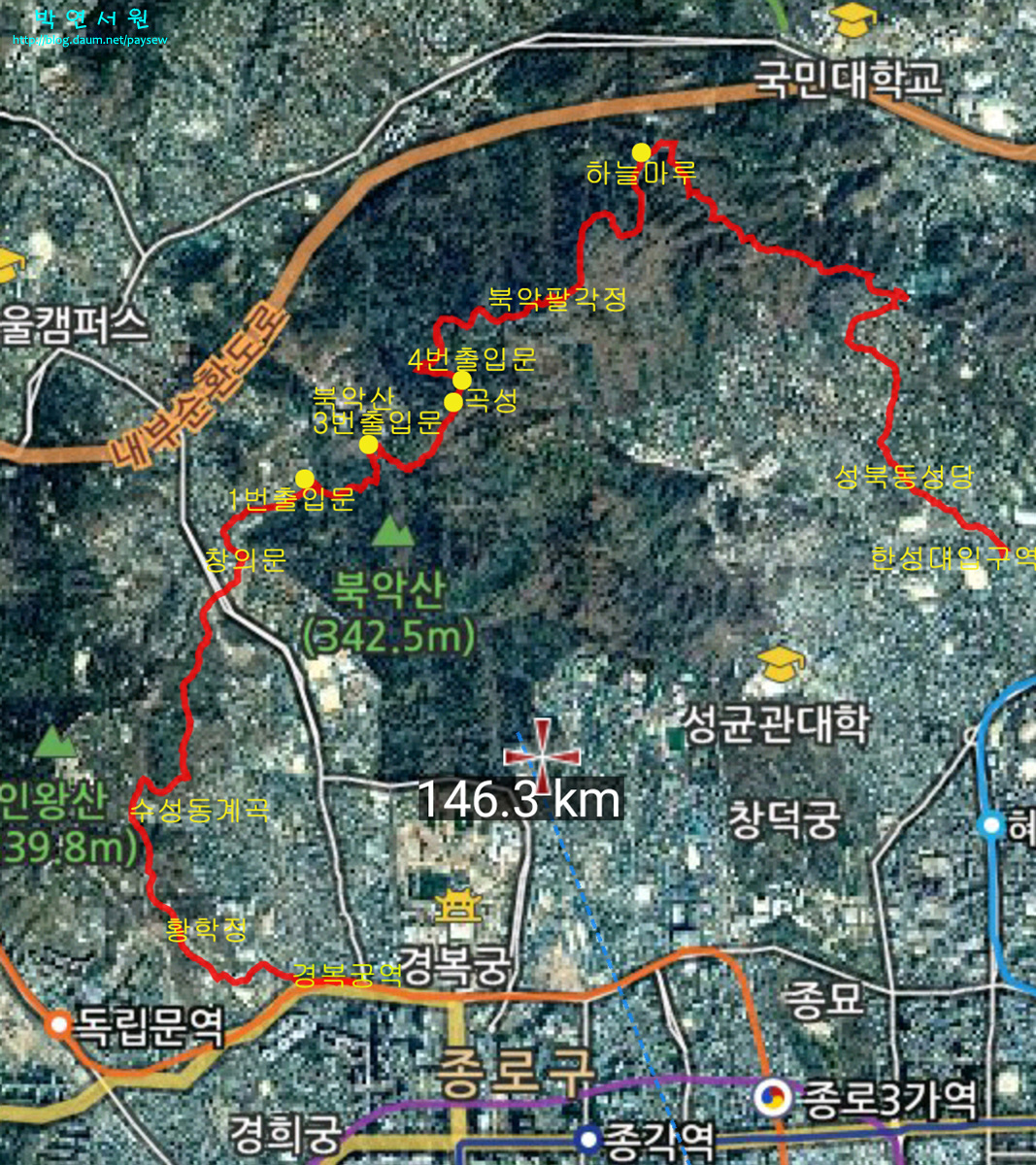 1. 경복궁역-인왕산자락길-윤동주문학관-북악산1번출입문-청운대안내소-곡장안내소-북악팔각정-하늘마루-한성대입구역