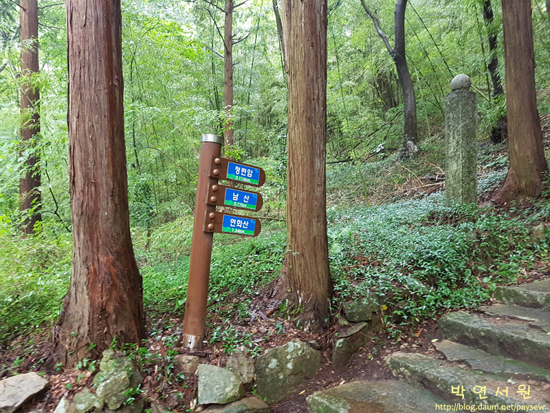 이 길을 따라 약 10분쯤 올라가면 왼쪽으로 계단 길과 만난다. 계단 길을 따르면 곧이어 암자다. 등산로는 찰피나무를 왼쪽에 두고 계곡 길로 올라간다. 청연암에서 남산안부까지 약 15분 소요.