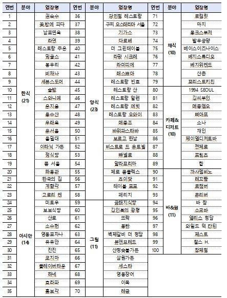 한식(21곳), 아시안(14곳), 양식(23곳), 그릴(11곳), 채식(10곳), 카페&디저트(10곳), 바&펍(11곳) 총 7개 분야로 구성됐다.