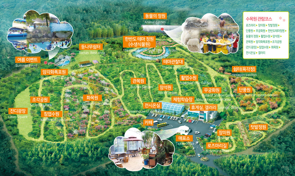 - 소나무(500여수형), 단풍나무(100여종), 장미(150여종), 무궁화(120여종),