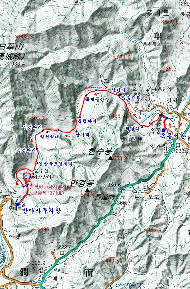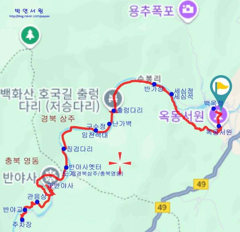동암역05:53-(급행)-신도림역06:18/06:20-사당역1번출구06:39/06:58-화서휴게소08:58/09:18-옥동서원(玉洞書院)[≒258/228,9/256.2, 회보문(懷寶門),청월루(淸越樓),온휘당(蘊輝堂),경덕사(景德祠)]09:57/10:05-백옥정(白玉亭)입구10:09/10:10(공사중이라 올라가지 못하고 되돌아옴)-옥동서원10:15/10:16-등산로입구(↑백옥정0.63,임천석대3.62,반야사옛터4.98)10:18-세심정(洗心亭),세심석(洗心石)10:41/10:42-구수천 2탄(물탕골~방성재) 표지판10:49-아취형다리(↑반야사4,1,임천석대1.8,→아취형다리,↓옥동서원1.0,백옥정0.8)10:55-징검다리10:58-반가상(半跏像)11:03/11:09(간식)-구수천 3탄(방성재~송골) 표지판11:10-구수천 4탄(송골~보장골) 표지판,회양목군락지11:21-백화산 호국길 출렁다리(저승다리)11:26/11:30-난가벽(欄柯璧)11:33/11:36-백화산 한성봉 등산로입구(→한성봉2.8)11:34-저승골입구(↑반야사옛터1.7,→저승골1.4,↓백화사입구2.5)11:35-구수정(龜水亭, ≒240/211.1/234.2, 4.9/4.492/4.4),임천석대(林千石臺),부처바위11:40/12:02(중식)-진불암(眞佛庵)옛터,백화산 한성봉 등산로입구(→한성봉2.7),저승골입구[↑반야사옛터1.2,→저승골0.1,↓수봉리(壽峰里)2.6]12:03-징검다리12:08/12:09-구수천 6탄(전투갱변~저승골) 표지판12:12-징검다리12:15/12:16-반야사옛터(↑충북영동,↓임천석대0.8),도계(道界, 경북상주/충북영동)12:21/12:23-반야사입구 징검다리12:43/12:44-백화산(白華山) 반야사[般若寺, ≒230/200.4/226.2, 7.7/7.04/7.0, 대웅전(大雄殿),지장전(地藏殿),극락전(極樂殿),실상원(實相院),영동 반야사 3층석탑(永同般若寺 三層石塔, 보물 제1371호),설법당(說法堂),적묵당(寂默堂)]12:45/13:03-징검다리13:04/13:05-관음상(觀音像)13:12-백화산 한성봉 등산로입구13:15-백화산 주행봉 등산로입구13:19-반야교(≒230/196.9/223.5, 9.3/8.377/8.3)13:20/13:23-반야교 주차장, 다원산장슈퍼식당13:24/13:27-계곡13:35/14:20(탁족 및 막걸리 시음)-반야교 주차장(≒225/193.7/218.4, 10.5/9.437/9.3)14:28/14:47-죽전휴게소16:49/16:58-양재역17:14/17:16-사당역14번출구17:28/17:33-신도림역17:50/18:03-(급행)-동암역18:27