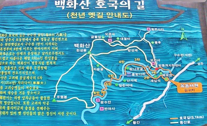 길의 시작은 옥동서원에서 부터이다. 백화산 호국의 길이라는 이름도 있다. 옥동서원은 1518년 황희 정승을 비롯, 지역 유림의 학문과 덕행을 추모하기 위해 건립한 지방학교이다.