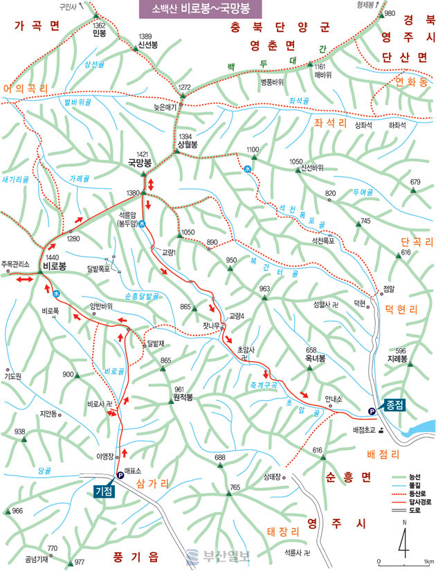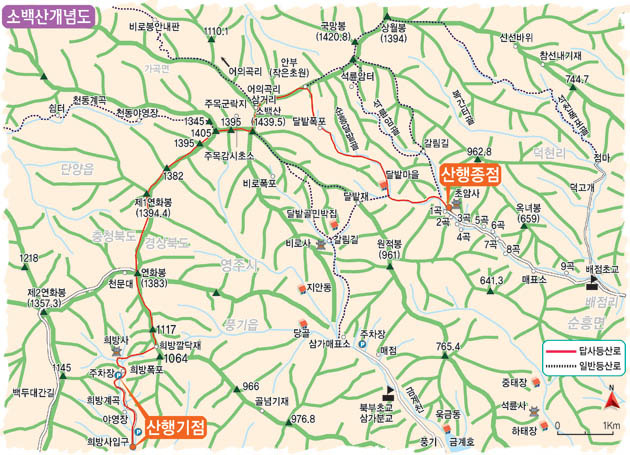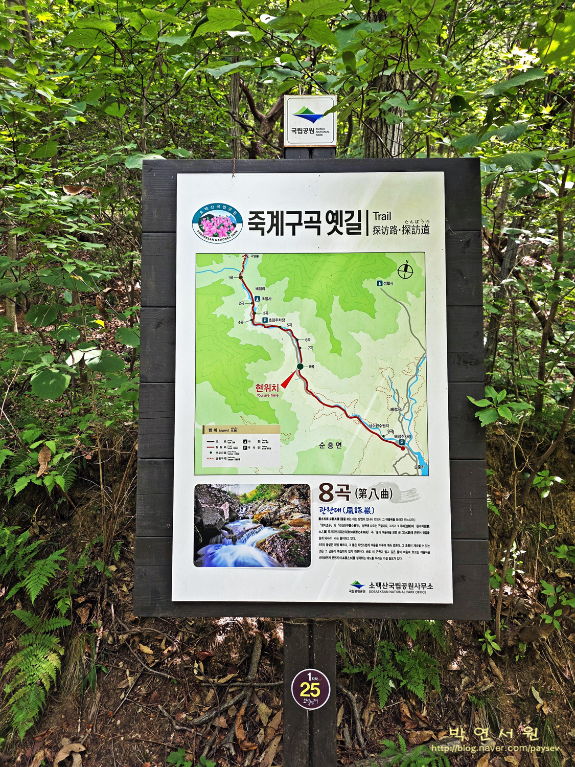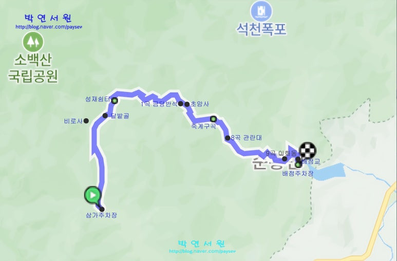 코스 : 소백산 삼가탐방지원센타(경북 영주시 풍기읍 삼가로 476 부근)-비로사-달밭골삼거리-잣나무 삼림욕장-자락길-초암사-죽계구곡-소백산 자락길 주차장(경북 영주시 순흥면 죽계로315번길 4) (8.6km/5시간)