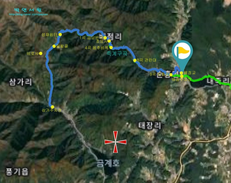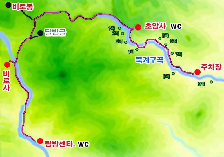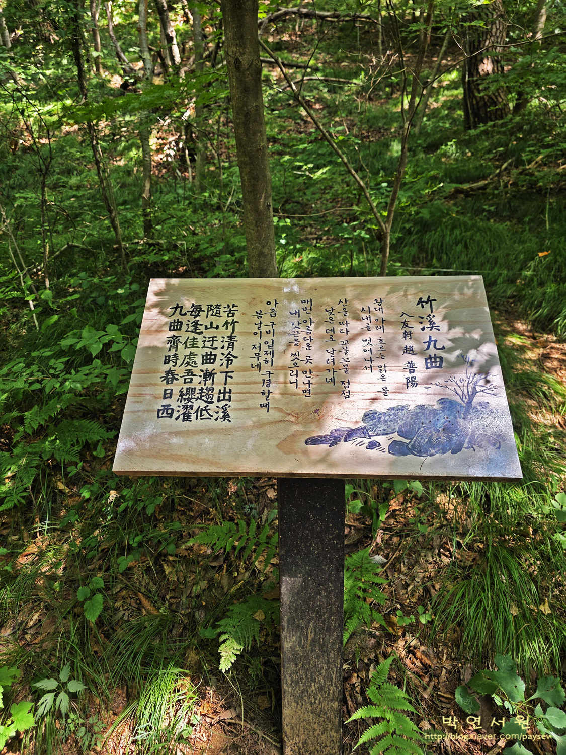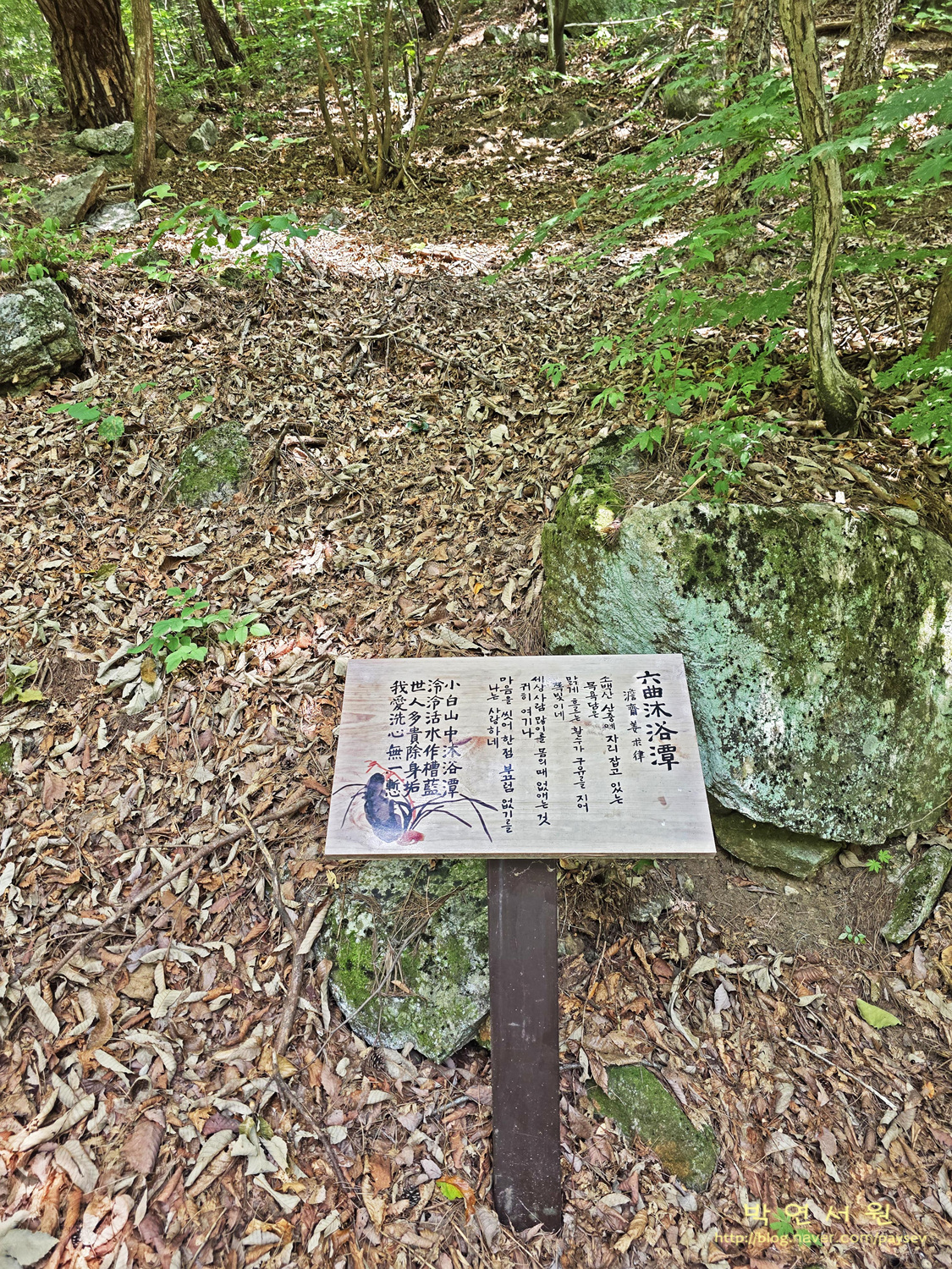 특기 : 이황은 소수서원 앞의 백운동 취한대를 1곡으로 정하고 계곡을 거슬러 올라가며 9곡을 이름 지었는데 순흥부사 신필하는 초암사 바로 위 금당반석을 1곡으로 정하고 물이 흐르는 방향으로 순서를 정하였다. 현재의 이름은 신필하가 정한 것이라고 한다.