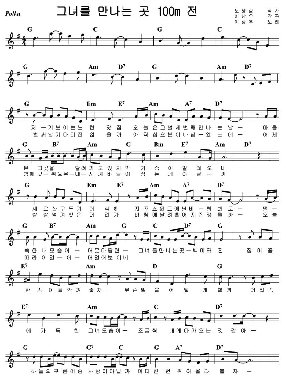 ▶<그녀를 만나는 곳 100m 전> 곡 정보: 작사 노영심, 작곡 이남우, 편곡 김명곤으로 1990년 4월 1일에 발표된 이상우 2집의 타이틀 곡. 원곡은 정민 <고백을 해야지>. 일상적인 가사와 산뜻한 멜로디의 <그녀를 만나는 곳 100m 전>으로 KBS 가요톱텐 5주 1위 골든컵과 MBC 등 지상파 순위 차트 1위 기록하는 빅히트